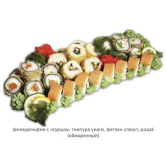 Филадельфия с огурцом, темпура унаги, фетаки спешл, додзё (обжаренный). Вес 850 гр.