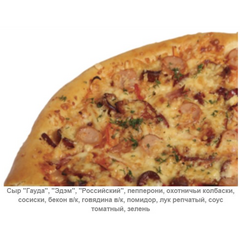 Сыр "Гауда", "Эдэм", "Российский", пепперони, охотничьи колбаски, сосиски, бекон в/к, говядина в/к, помидор, лук репчатый, соус томатный, зелень. Вес 950 гр.