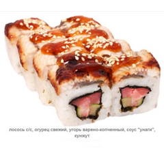 Лосось с/с, огурец свежий, угорь варено-копченный, соус "унаги", кунжут. Вес 200 гр.