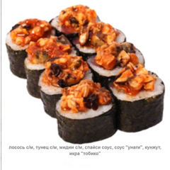 Лосось с/м, тунец с/м, мидии с/м, спайси соус, соус "унаги", кунжут, икра "тобико". Вес 180 гр.