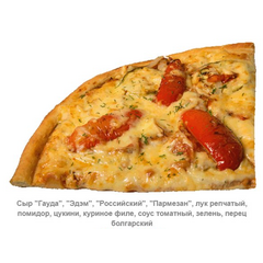 Сыр "Гауда", "Эдэм", "Российский", "Пармезан", лук репчатый, помидор, цукини, куриное филе, соус томатный, зелень, перец болгарский. Вес 750 гр.