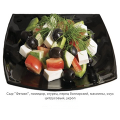 Сыр "Фетаки", помидор, огурец, перец болгарский, маслины, соус цитрусовый, укроп. Вес 170/30 гр.