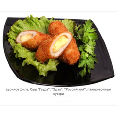 Куриное филе, Сыр "Гауда", "Эдэм", "Российский", панировочные сухари. Вес 150 гр.