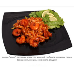 Лапша "удон", тигровые креветки, кальмары, морковь, перец болгарский, специи, соус кисло-сладкий. Вес 250 гр.