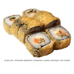 Угорь в/к, тигровая креветка отварная, огурец, авокадо, лук порей. Вес 200 гр.