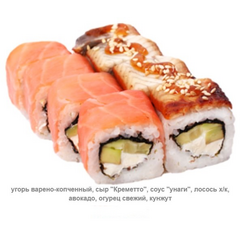 Угорь варено-копченный, сыр "Креметто", соус "унаги", лосось х/к, авокадо, огурец свежий, кунжут. Вес 200 гр.