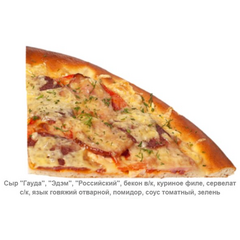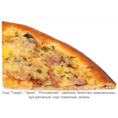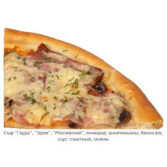 Сыр "Гауда", "Эдэм", "Российский", свинина, бекон в/к, шампиньоны, лук репчатый, соус томатный, зелень. Вес 900 гр.