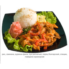 Рис, свинина, куриное филе, лук репчатый, перец болгарский, специи, говядина мраморная. Вес 200/150 гр.