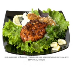 Рис, куриная отбивная, глазированная крахмальным соусом, лук репчатый, специи. Вес 200/150 гр.