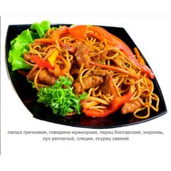 Лапша гречневая, говядина мраморная, перец болгарский, морковь, лук репчатый, специи, огурец свежий. Вес 310 гр.