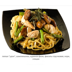 Лапша "удон", шампиньоны, куриное филе, фасоль стручковая, нори, специи. Вес 280 гр.