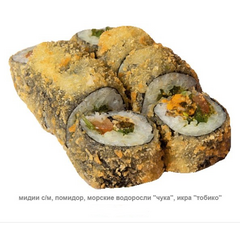 Мидии с/м, помидор, морские водоросли "чука", икра "тобико". Вес 210 гр.