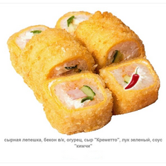 Сырная лепешка, бекон в/к, огурец, сыр "Креметто", лук зеленый, соус "кимчи". Вес 220 гр.