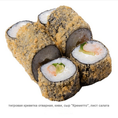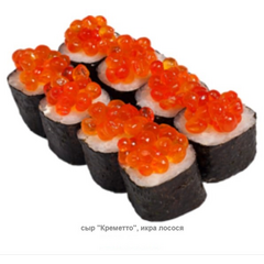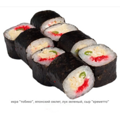 Икра "тобико", японский омлет, лук зеленый, сыр "креметто". Вес 135 гр.