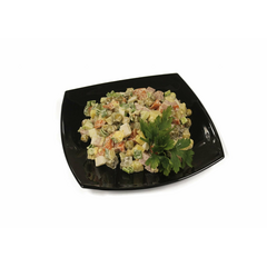 Картофель, морковь отварные, огурец свежий, огурец маринованный, зеленый горошек, лук репчатый, лук зеленый, майонез. Вес 250 гр.