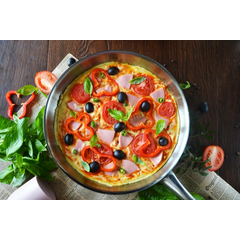 Пицца на толстом тесте с ветчиной, сыром моцарелла, кукурузой, маринованными огурчиками, болгарским перцем.