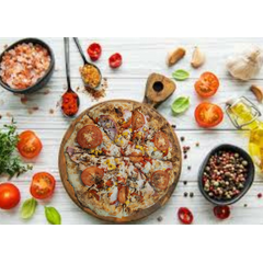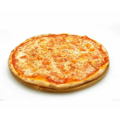 Пицца на толстом тесте с мясом шашлыка/курицей, колбасой, ветчиной, болгарским перцем, маринованными огурцами, помидорами и сыром моцарелла
