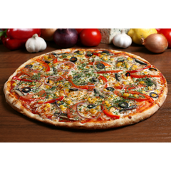 Пицца на пышном вкусном тесте с фирменным соусом, маринованными огурчиками, болгарским перчиком, кукурузой, помидорами и сыром моцарелла