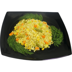Состав: рис, морковь, зеленый горошек, кукуруза, цукини, фасоль стручковая, заправка. Вес 320 гр.