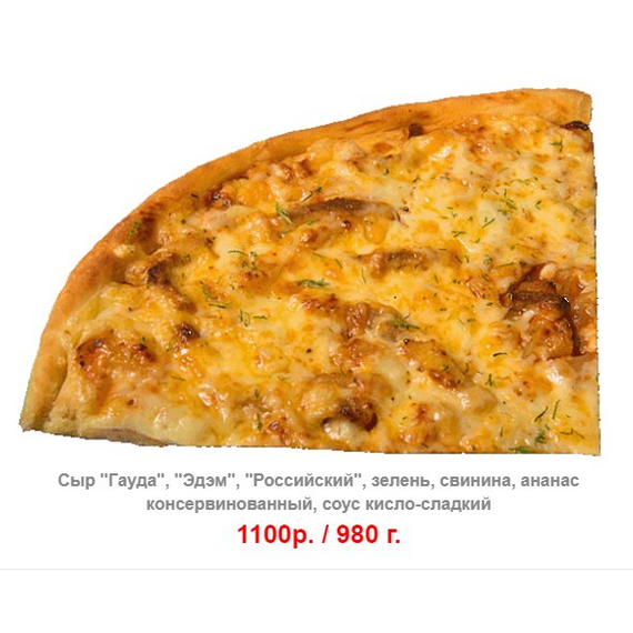 Сыр "Гауда", "Эдэм", "Российский", зелень, свинина, ананас консервинованный, соус кисло-сладкий