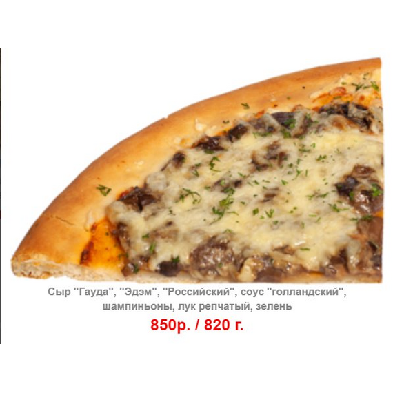 Сыр "Гауда", "Эдэм", "Российский", соус "голландский", шампиньоны, лук репчатый,сливки.