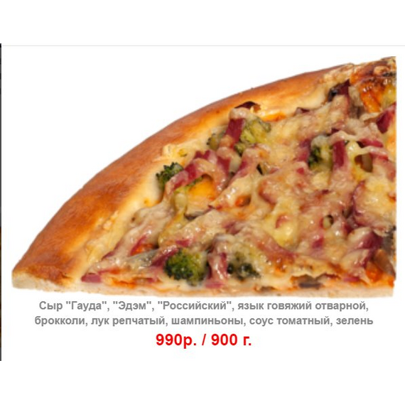 Сыр "Гауда", "Эдэм", "Российский", язык говяжий отварной, брокколи, лук репчатый, шампиньоны, соус томатный, зелень