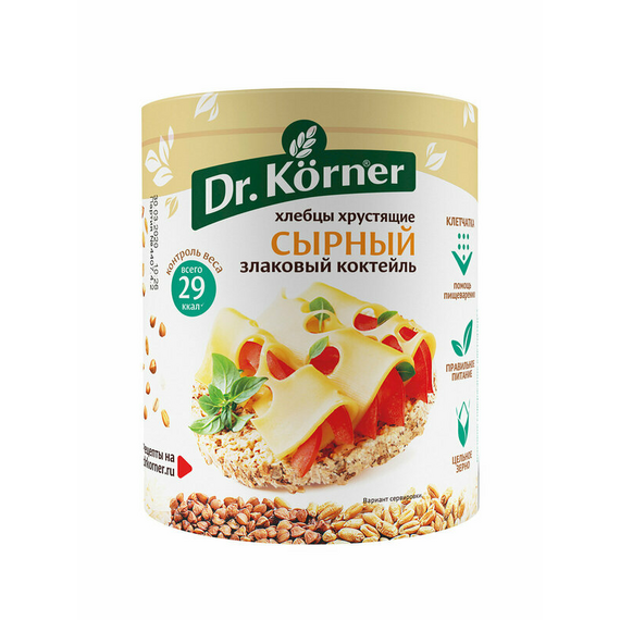 Злаковые хлебцы бренда Dr. Korner с сырным вкусом - отличная замена вредным чипсам, сухарикам и снекам. Хлебцы, обладающие приятным вкусом сырного лакомства понравятся всем ценителям настоящего сыра. Благодаря клетчатке и цельным злакам (пшеница, рис, гречка) продукт помогает выводить токсины из организма и улучшает общее самочувствие. Хлебцы "Злаковый коктейль" со вкусом сыра не содержат дрожжей и иных вредных примесей, а потому отлично подходят для диетического питания.