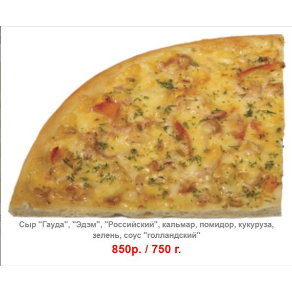 Сыр "Гауда", "Эдэм", "Российский", кальмар, помидор, кукуруза, зелень, соус "голландский"