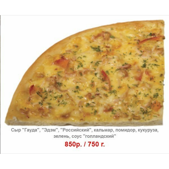 Сыр "Гауда", "Эдэм", "Российский", кальмар, помидор, кукуруза, зелень, соус "голландский"