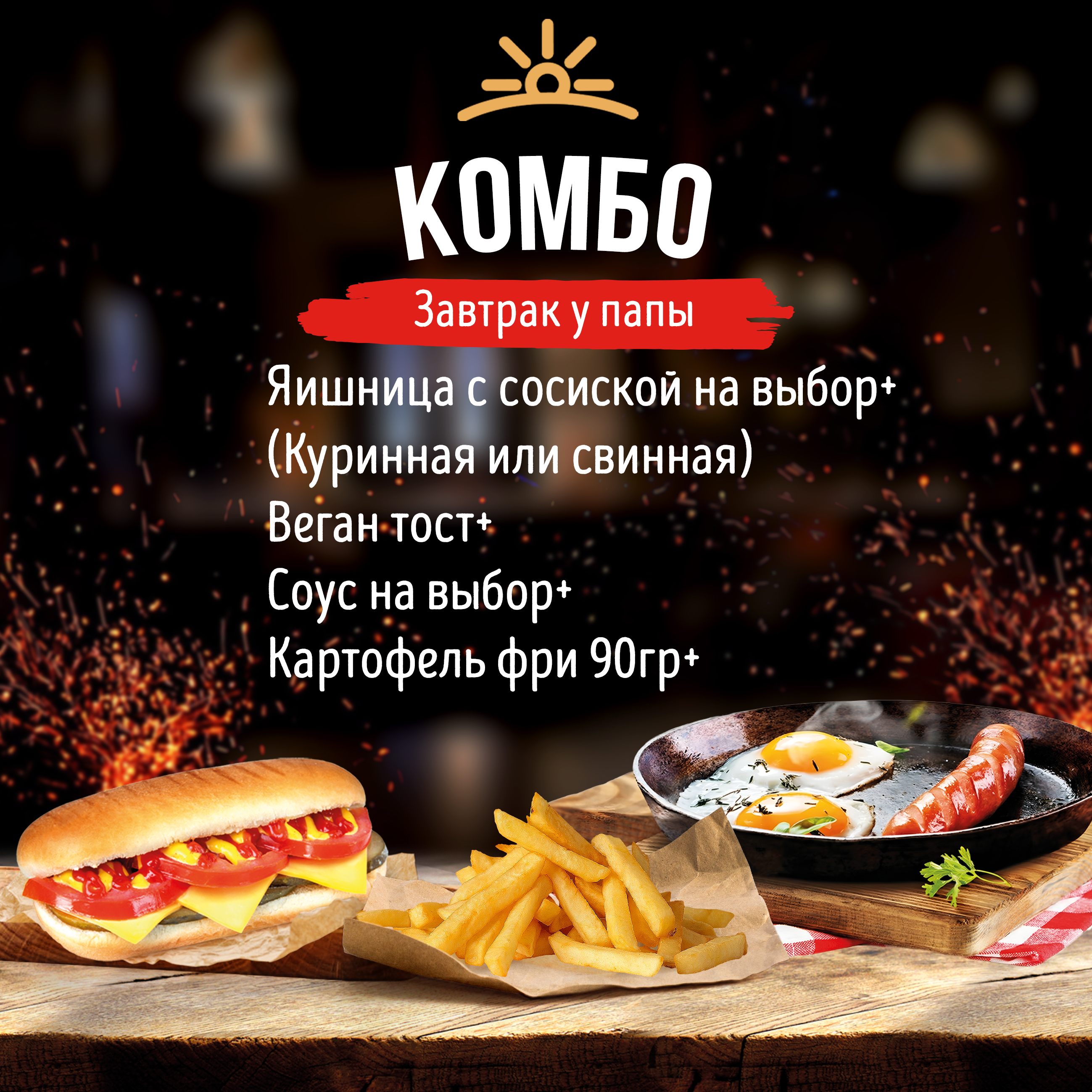 Картофель фри, яичница с сосиской, веган тост, соус на выбор