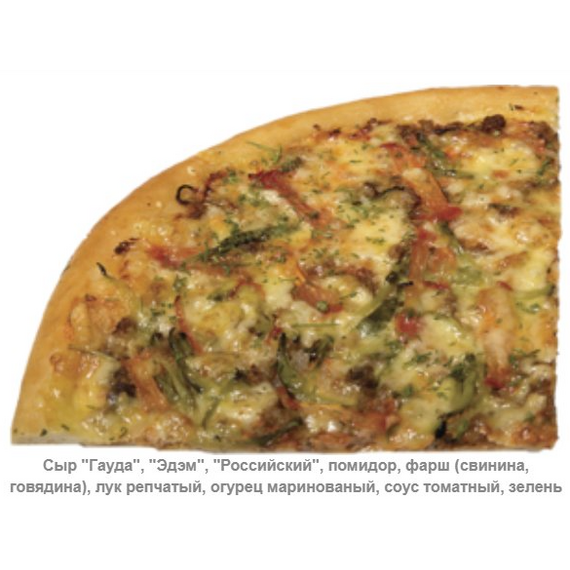 Сыр "Гауда", "Эдэм", "Российский", помидор, фарш (свинина, говядина), лук репчатый, огурец маринованый, соус томатный, зелень. Вес 850 гр.