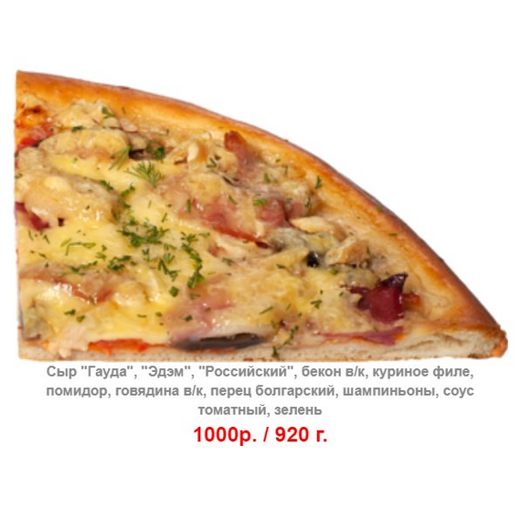 Сыр "Гауда", "Эдэм", "Российский", бекон в/к, куриное филе, помидор, говядина в/к, перец болгарский, шампиньоны, соус томатный, зелень