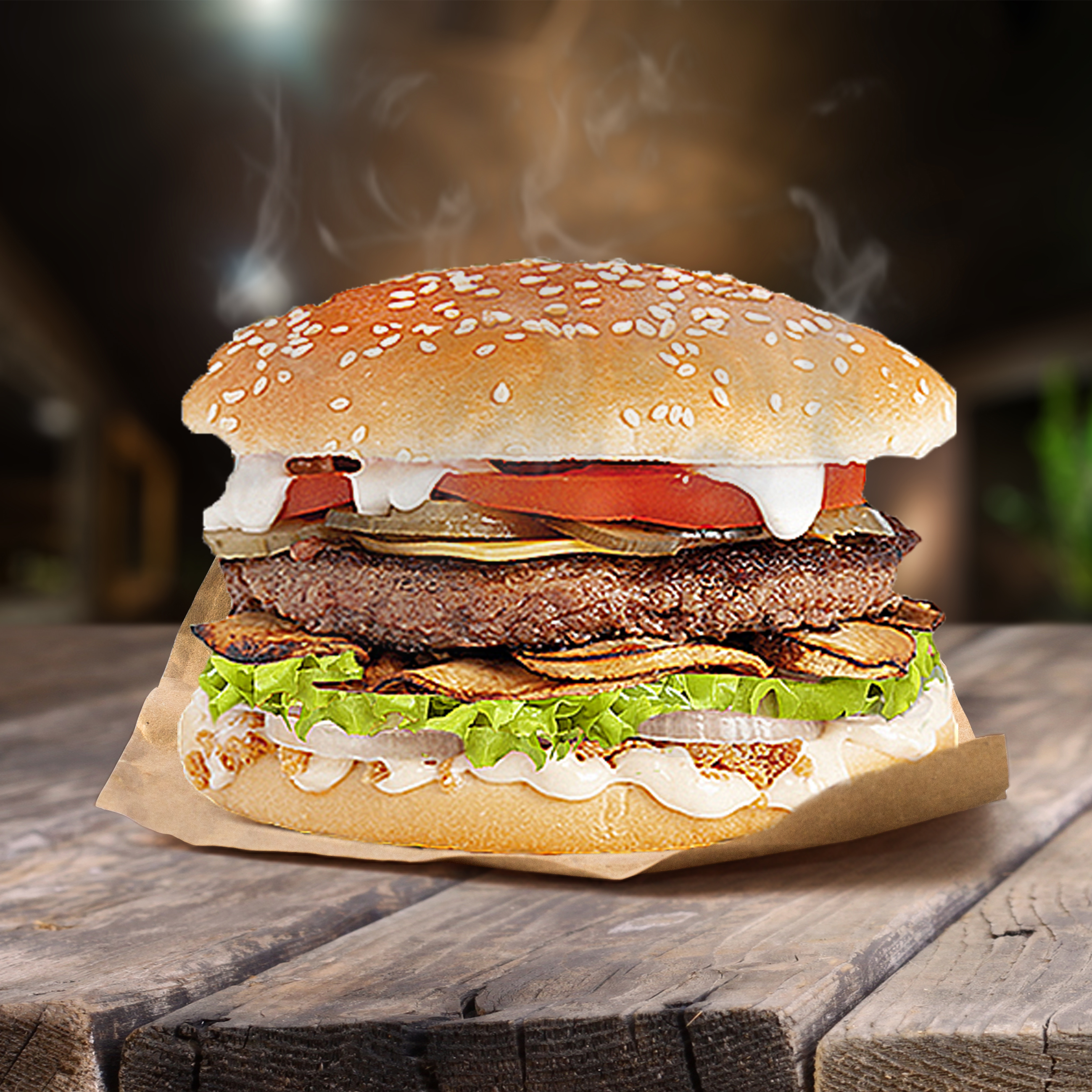 Бургер с большой говяжьей котлетой, грибным соусом, свежими огурцами, помидором, луком свежим и жаренным, листом салата, ломтиком сыра и шампиньонами на гриле