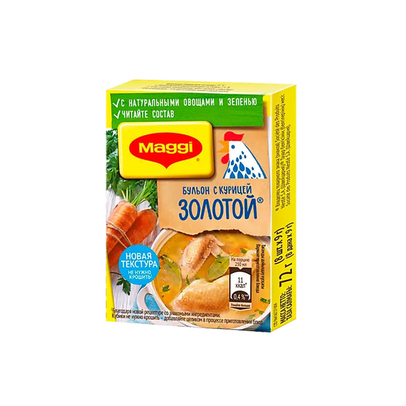 Йодированная соль (соль, йодат калия), крахмал кукурузный, сахар, сухой сироп глюкозы, говяжий жир топленый, кукурузный соус (крахмал кукурузный, соль), куриный жир топленый (2 %), вода, ароматизаторы (курица, укроп, свежие травы (содержит глютен)), овощи и зелень сушеные (0,9 %) (сельдерей, петрушка, морковь (0,1 %), чеснок, лук репчатый), специи молотые (куркума, перец черный, карри, лавровый лист), регулятор кислотности (лимонная кислота). Продукт может содержать молоко.