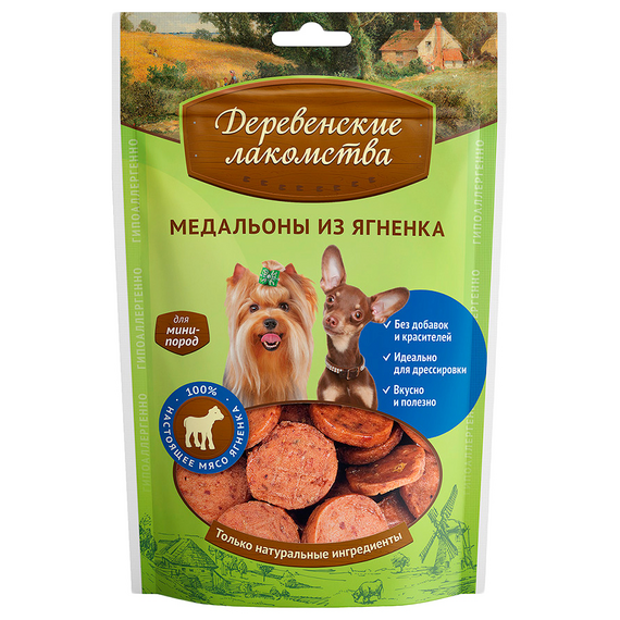 В основе «Деревенских лакомств» лежат традиции поощрения домашних питомцев, совмещенные с современными знаниями в области ветеринарии и здорового питания животных. Натуральные лакомства для собак изготовлены с учетом сбалансированного питания из качественных, безопасных и тщательно подобранных ингредиентов. Идеальные для дрессуры и поощрения " Деревенские лакомства" отбираются и обрабатываются вручную и могут служить эталоном лакомств для домашних животных. Сочные кусочки мяса ягнёнка великолепно подходят для угощения собак маленьких пород, легко жуются и обладают высокими питательными свойствами