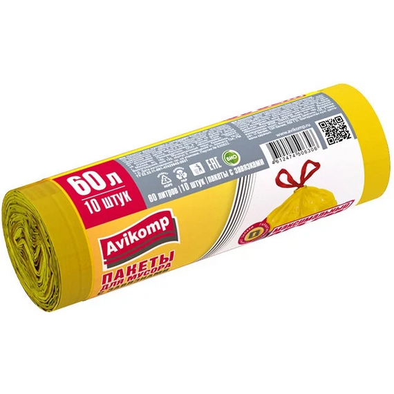 Мешки для мусора АВИКОМП 60л 10шт с завязками желтый рулон