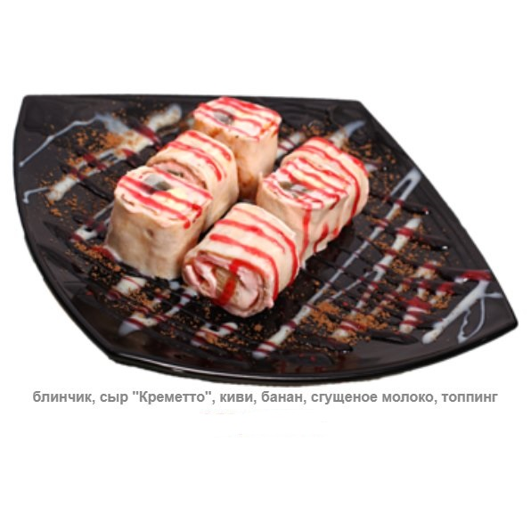 Блинчик, сыр "Креметто", киви, банан, сгущенное молоко, топпинг. Вес 200 гр.