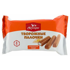 творог (молоко цельное, молоко восстановленное из сухого молока, масло сливочное, закваска, молокосвёртывающий ферментный препарат), сахар-песок, глазурь кондитерская «Карамельная» (сахар-песок, заменитель какао-масла лауриновый (CBS), какао-порошок, молоко сухое обезжиренное, эмульгатор...