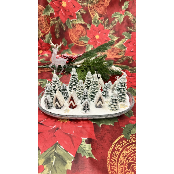Окунитесь в атмосферу зимней сказки с нашей уникальной композицией из декоративных свечей! Эта изысканная композиция воссоздаёт уютный заснеженный лес с миниатюрными домиками и пушистыми ёлочками, покрытыми «снегом».