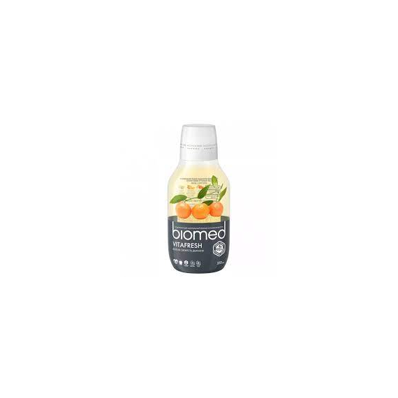 Ополаскиватель Biomed Vitafresh обладает антибактериальными свойствами и предназначен для ежедневного ухода за полостью рта. Средство, изготовленное без добавления силиконов, парабенов, этилового спирта и триклозана, фтора и красителей, на 98% состоит из натуральных компонентов. Жидкость с цитрусовым ароматом не просто освежает дыхание. Формула ополаскивателя содержит компоненты, обеспечивающие эффективное удаление зубного налета, укрепляющие эмаль, без участия антибиотиков подавляющие размножение болезнетворных микроорганизмов. Кальций, цинк, медь и магний благотворно влияют на состояние эмали. Экстракт ананаса очищает и осветляет зубы. Эфирное масло лимона в сочетании с подорожником и березой оздоравливают полость рта.