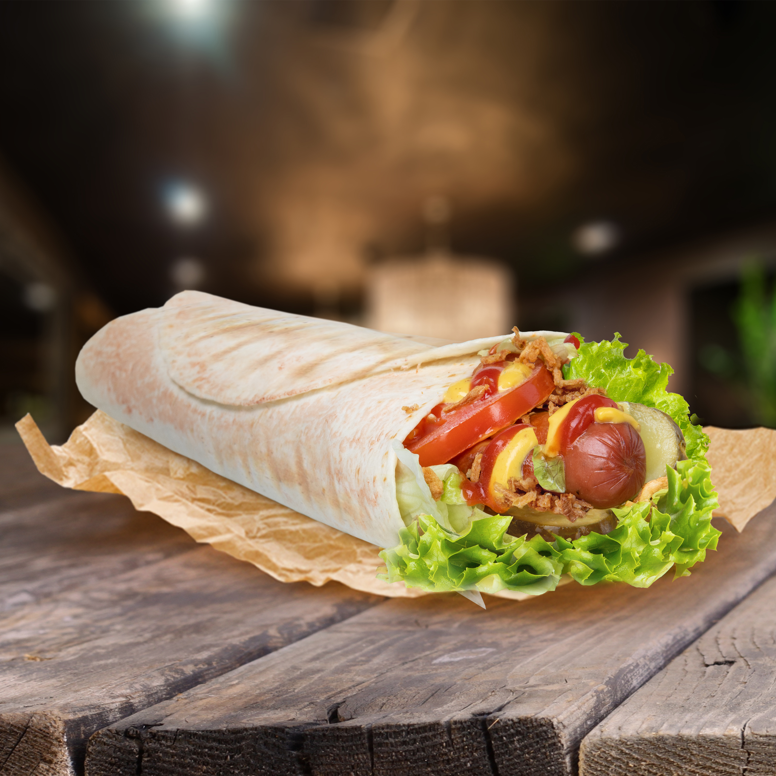 Сочная сосиска на выбор (курица, свинина, говядина), кетчуп, горчица, соленые огурчики, помидоры, листья салата и жаренный вьетнамский лук, завернутые в пшеничную тортилью.