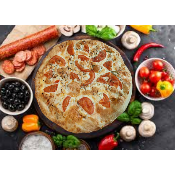 Пицца на толстом тесте с мясом курицы, маринованными огурчиками, болгарским перцем, сыром моцарела, кукурузой