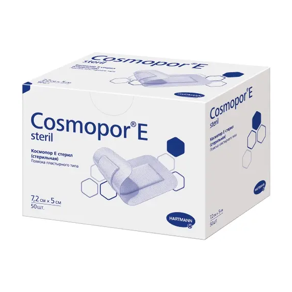 Повязки пластырного типа стерильные Cosmopor E Steril/Космопор Е стерил, размер 7,5х5 см - стерильная самоклеящаяся повязка на рану с впитывающей подушечкой для ран с умеренной экссудацией, каждая повязка упакована индивидуально. Упаковка содержит 50 повязок. Мягкий, воздухопроницаемый, нетканый материал обеспечивает высокий комфорт при использовании и препятствует мацерации кожи вокруг раны. Эти повязки имеют высокую впитывающую способность и быстро впитывают кровь и экссудат, что способствует быстрому заживлению тканей. Специальная микросетка на впитывающей подушечке препятствует присыханию повязки к ране, и ее смена проходит безболезненно. Закругленные края повязки позволяют ей крепко держаться и не отклеиваться. Применяется в таких случаях, как: послеоперационное ведение ушитых ран, для защиты ран после медицинских процедур (дезинфекция, очищение раны и т.д.); стерильного ухода при поверхностных повреждениях кожи (порезы, ссадины, потертости и т.д.), первой помощи; абсорбции экссудата у ран с умеренным отделяемым; фиксации атравматических повязок. Смена повязки происходит в индивидуальном режиме, но не реже, чем один раз в три дня.
