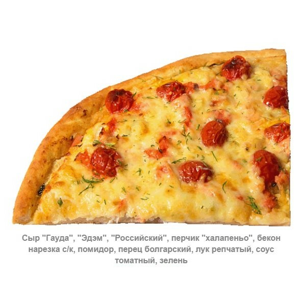 Сыр "Гауда", "Эдэм", "Российский", перчик "халапеньо", бекон нарезка с/к, помидор, перец болгарский, лук репчатый, соус томатный, зелень
