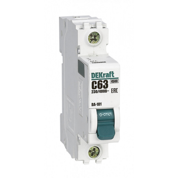 Автоматический выключатель серии ВА-101 DEKraft; 1P; номинальный ток 63 А; характеристика С; отключающая способность 4,5 кА. Новый механизм расцепления мгновенно разрывает цепь при возникновении аварии. 5 монолитных заклепок повышают прочность корпуса аппарата. Сплошная лицевая панель обеспечивает безопасность эксплуатации аппарата. Боковые каналы охлаждения повышают стабильность работы при высоких температурах окружающей среды. Полностью автоматизированный контроль качества производства.