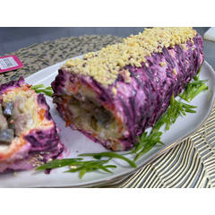 Порция от 800-1000 грамм . (Классический салат шуба в виде рулета - сельдь малосольная, лук, картофель отварной, морковь отварная, свекла отварная, яйцо отварное, майонез)