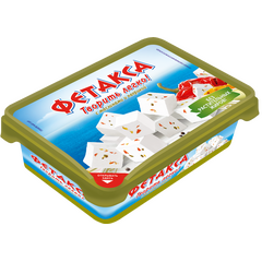сыр рассольный, сыр полутвердый, масло сливочное, концентрат молочного белка, пахта сухая, паприка маринованная (паприка, уксус, соль пищевая, подсластитель сахарин), маслины без косточек (оливки, вода, соль пищевая, фиксатор окраски глюконат железа), соль, желатин пищевой, стабилизаторы...