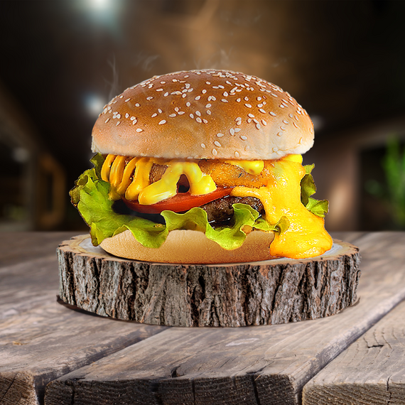 Сочная котлета из 100% говядины, приготовленной на гриле. С наполнением наивкуснейшего сыра : Сырной котлеты, сырного соуса и плавленного Чеддера в виде топпинга. Свежие овощи, хрустящий жаренный лук и кетчуп.