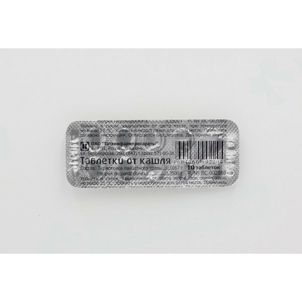 Состав (на 1 таблетку): Активные компоненты: Термопсиса ланцетного травы порошок - 0,0067 г Натрия гидрокарбоната - 0,250 г Вспомогательные вещества: крахмал картофельный, тальк.