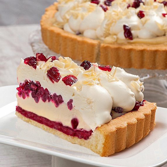 Торт с начинкой из брусники и белого шоколада, взбитыми сливками, украшенный белым шоколадом и клюквой.